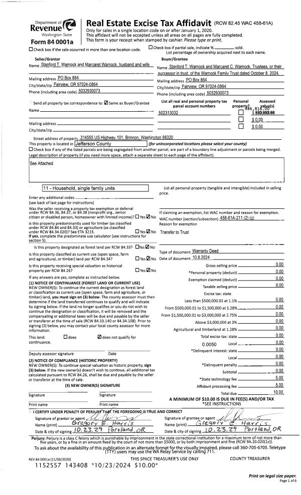| 1 | 10/08/2024 | WD | Warranty Deed | STANFORD T & MARGARET WARNOCK | WARNOCK FAMILY TRUST | | | | 143408 | |