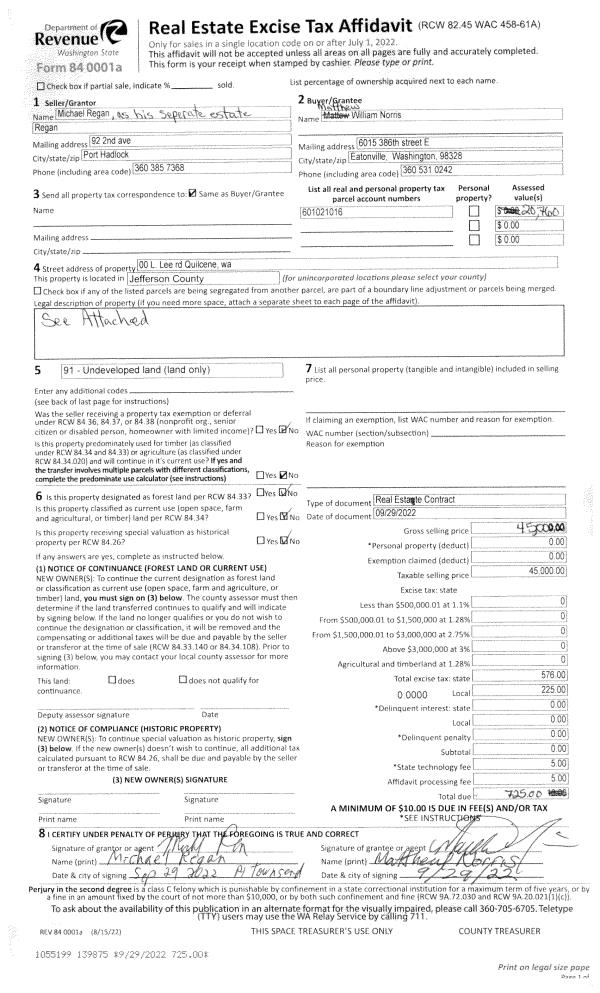| 2 | 09/29/2022 | REC | Real Estate Contract | MICHAEL P REGAN | MATTHEW W NORRIS | | | $45,000.00 | 139875 | |