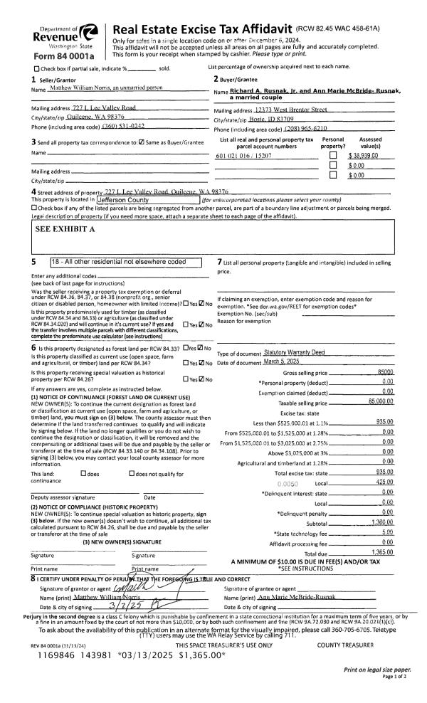 | 1 | 03/05/2025 | SWD | Statutory Warranty Deed | MATTHEW W NORRIS | RICHARD A RUSNAK JR & | | | $85,000.00 | 143981 | |
