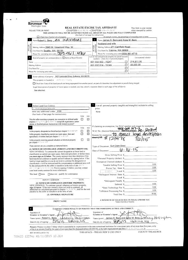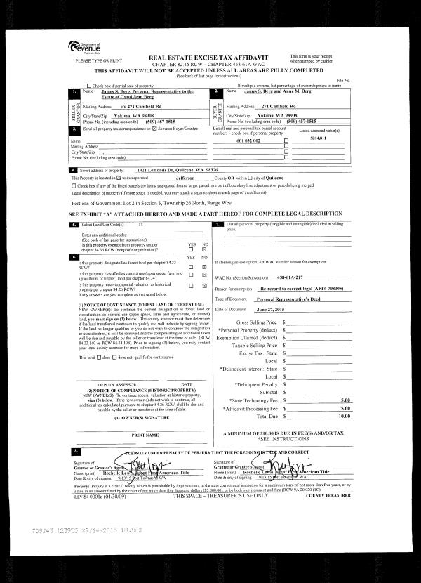 | 1 | 06/27/2015 | PRD | Personal Representatives Deed | ESTATE OF CAROL BERG | JAMES S & ANNE M BERG | | | | 123477 | |