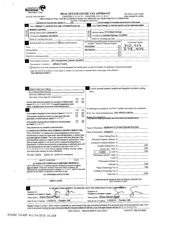 | 1 | 07/30/2020 | SWD | Statutory Warranty Deed | JOAN LEMONDS ROUSH LIFE ESTATE | STATE OF WASHINGTON-DNR | | | $255,000.00 | 134773 | |
