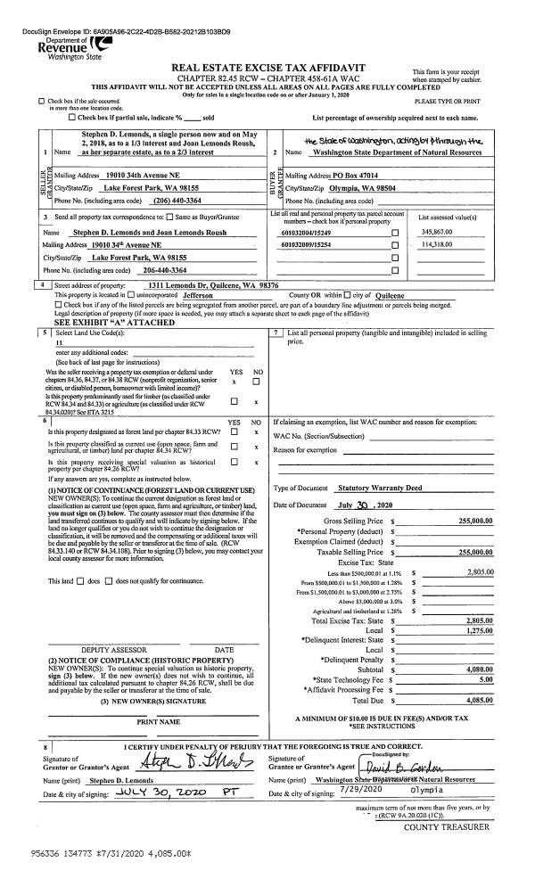 | 1 | 07/30/2020 | SWD | Statutory Warranty Deed | JOAN LEMONDS ROUSH LIFE ESTATE | STATE OF WASHINGTON-DNR | | | $255,000.00 | 134773 | |