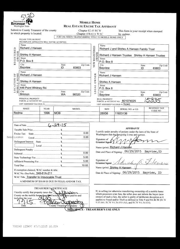 | Mailing Address: | SHIRLEY A HANSEN TRUSTEE C/O CHRIS HANSEN PO BOX 595 BAYVIEW, ID 83803-0595 | % Ownership: | 100.0000000000% |