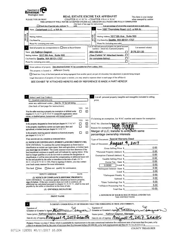 | 4 | 09/25/2012 | SWD | Statutory Warranty Deed | WALTON, KATHRYN B | CEDARHAWK LLC | 0 | 0 | $600,000.00 | 118153 | 0 |