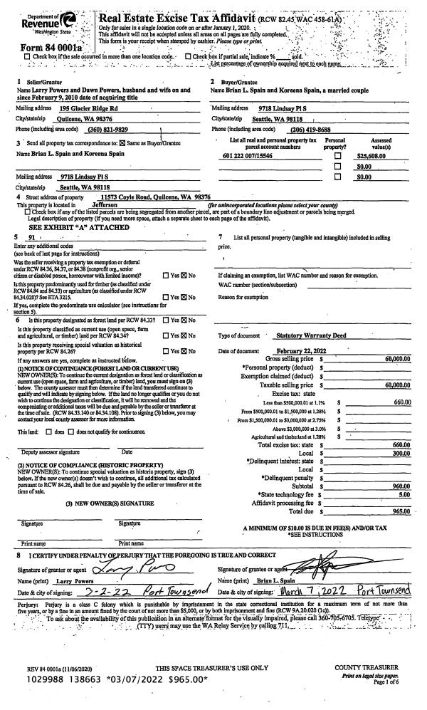 | 3 | 02/22/2022 | SWD | Statutory Warranty Deed | LARRY POWERS | BRIAN L & KOREENA SPAIN | | | $60,000.00 | 138663 | |