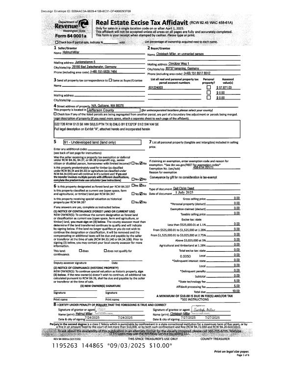 | 1 | 07/01/2025 | QCD | Quit Claim Deed | HELMUT MILLER | CHRISTOPHER MILLER | | | | 144865 | |