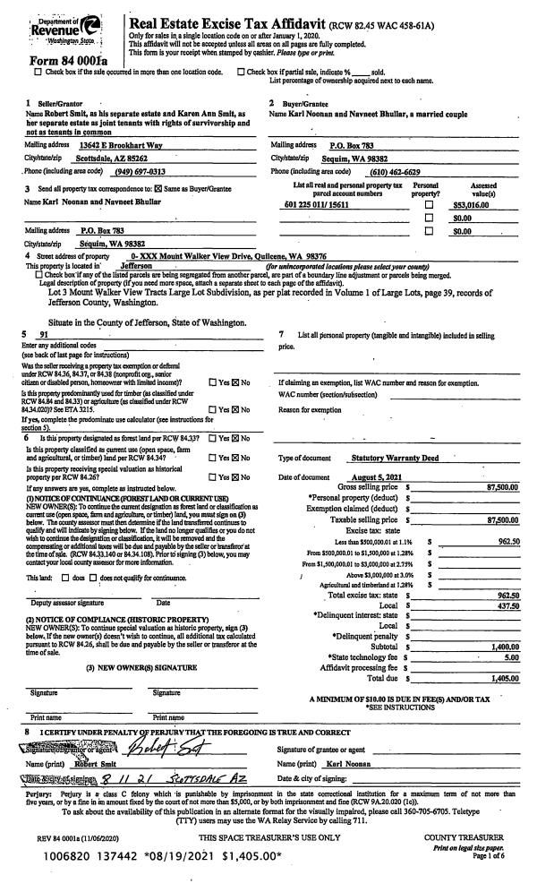 | 1 | 08/05/2021 | SWD | Statutory Warranty Deed | ROBERT & KAREN SMIT | KARL NOONAN & NAVNEET BHULLAR | | | $87,500.00 | 137442 | |