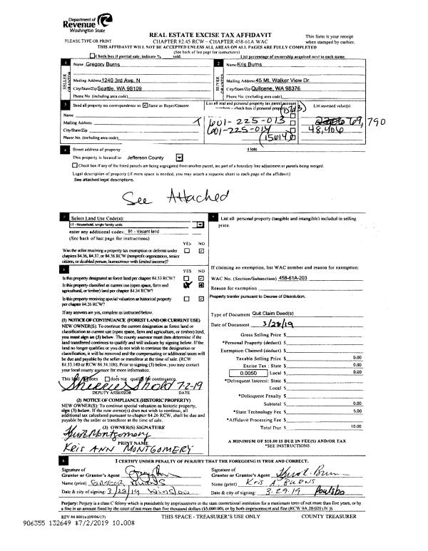 | 2 | 03/28/2019 | QCD | Quit Claim Deed | GREGORY BURNS | KRIS BURNS | | | | 132649 | |
