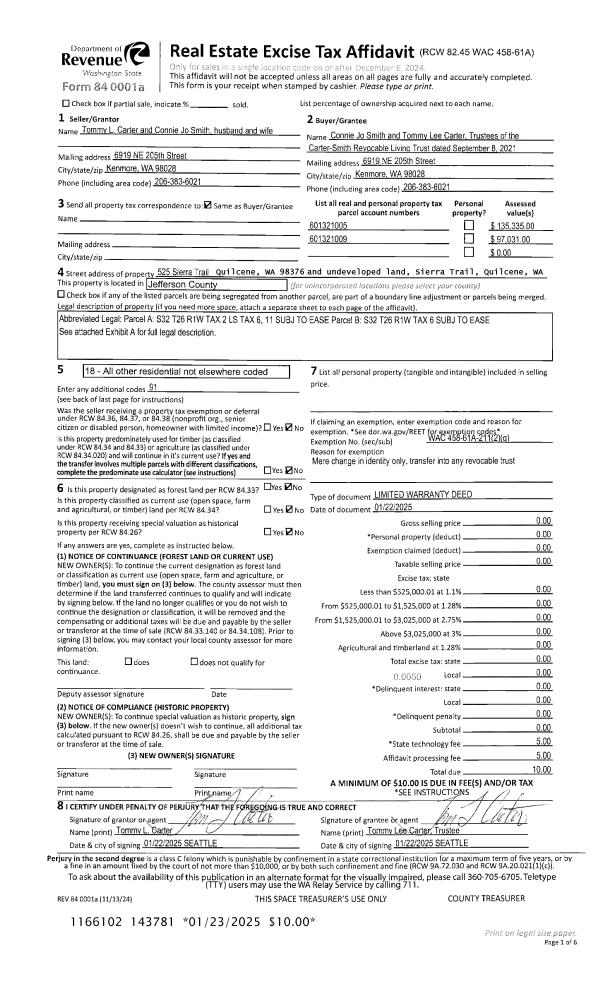 | 1 | 01/22/2025 | SLWD | Special Limited Warranty Deed | TOMMY L CARTER | CARTER-SMITH REVOCABLE LIVING TRUST | | | | 143781 | |