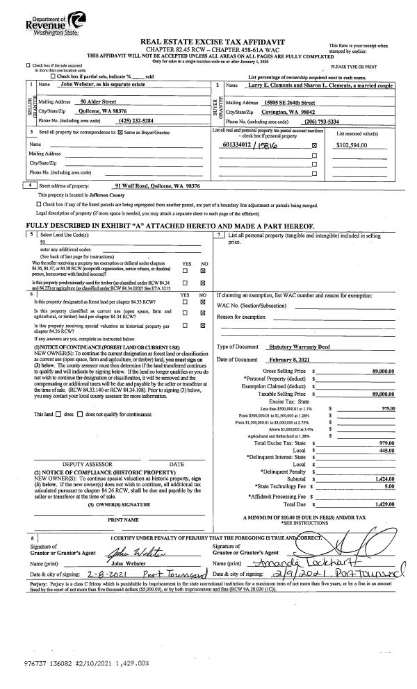 | 2 | 02/08/2021 | SWD | Statutory Warranty Deed | JOHN WEBSTER | LARRY E & SHARON L CLEMENTS | | | $89,000.00 | 136082 | |