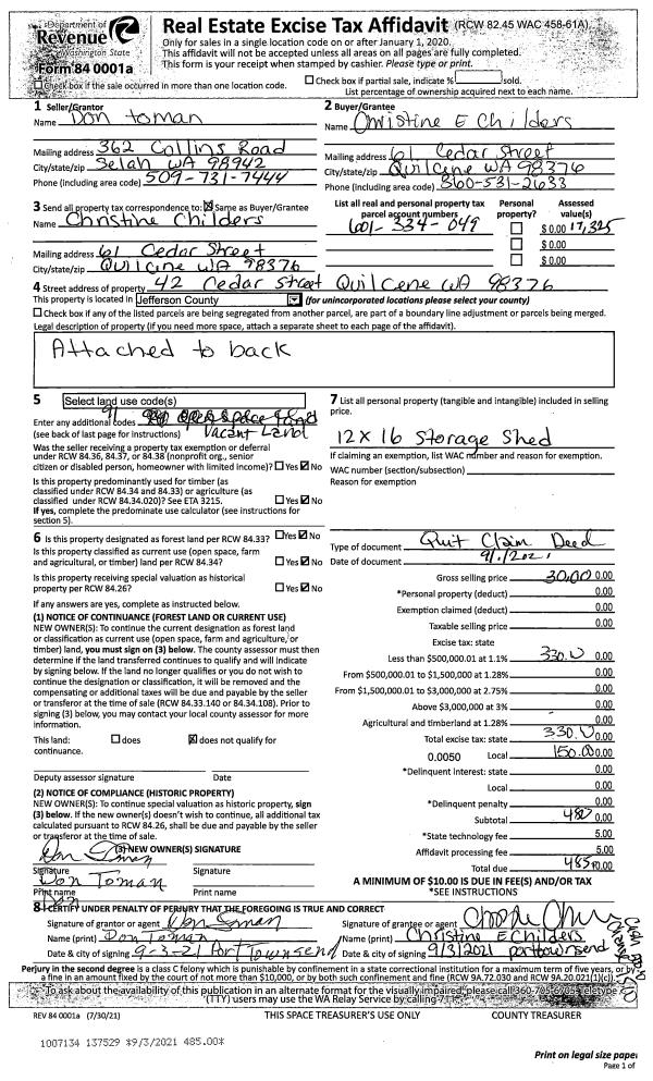 | 2 | 09/01/2021 | QCD | Quit Claim Deed | DONALD TOMAN | CHRISTINE E CHILDERS | | | $30,000.00 | 137529 | |