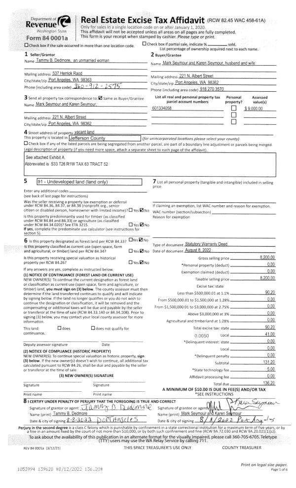| 1 | 08/08/2022 | SWD | Statutory Warranty Deed | TAMMY B DEDMORE | MARK & KAREN SEYMOUR | | | $8,200.00 | 139628 | |