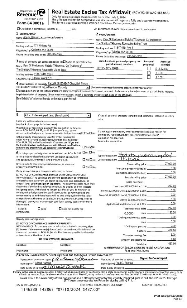| 1 | 07/05/2024 | SWD | Statutory Warranty Deed | ARLENE I HANSEN | SHELTON/TIKHONOVA REVOCABLE LIVING TRUST | | | $27,000.00 | 142863 | |