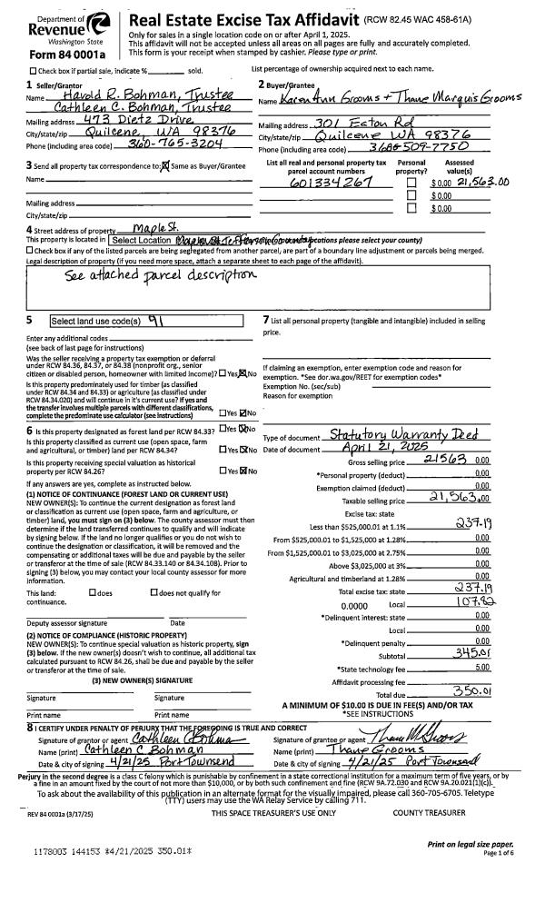 | 1 | 04/21/2025 | SWD | Statutory Warranty Deed | HAROLD R BOHMAN TRSTEE | KAREN ANN GROOMS AND THANE MARQUIS GROOMS | | | $21,563.00 | 144153 | |