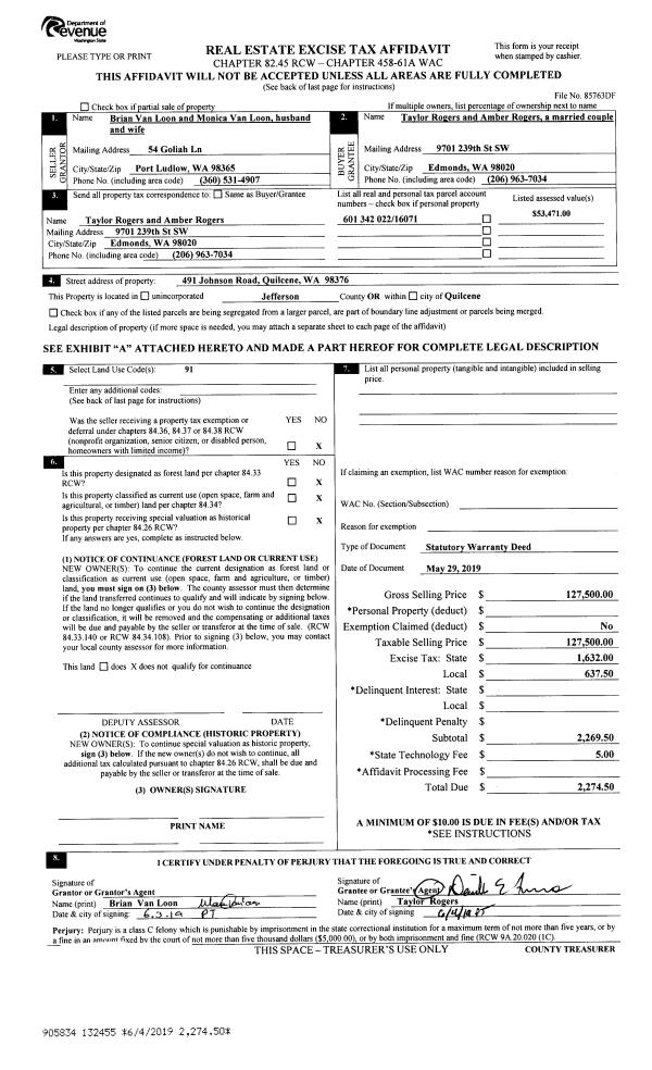 | 1 | 05/29/2019 | SWD | Statutory Warranty Deed | BRIAN H & MONICA C VAN LOON | TAYLOR & AMBER ROGERS | | | $127,500.00 | 132455 | |