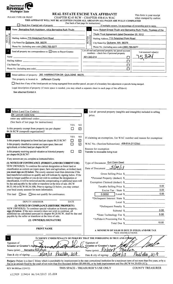 | 1 | 06/14/2013 | QCD | Quit Claim Deed | BERNADINE R THULIN | THULIN TRUST AGREEMENT | | | | 119414 | |
