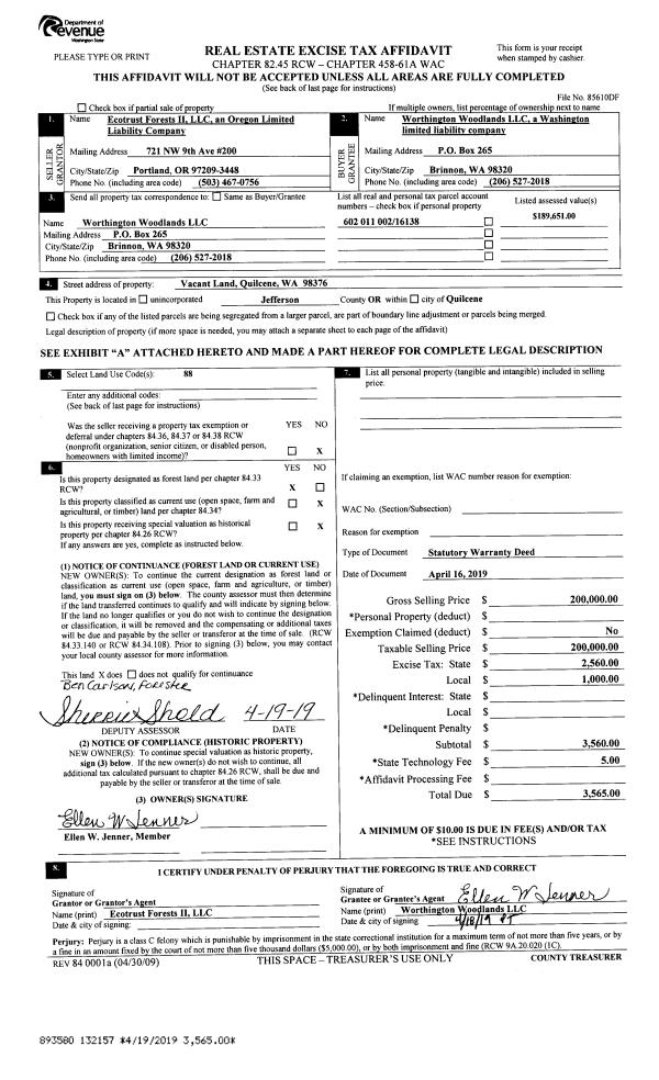| 1 | 04/16/2019 | SWD | Statutory Warranty Deed | ECOTRUST FORESTS II LLC | WORTHINGTON WOODLANDS LLC | | | $200,000.00 | 132157 | |