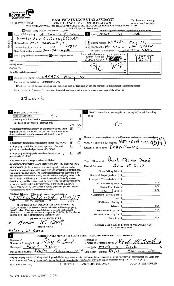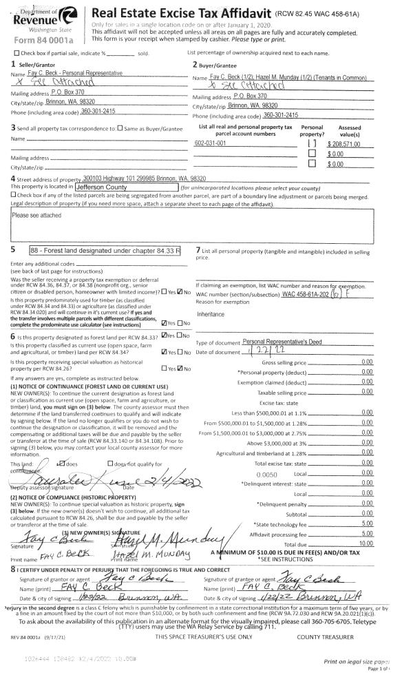 | 1 | 02/04/2022 | PRD | Personal Representatives Deed | FAY C BECK AS PR TO H W COOK ESTATE | FAY C BECK | | | | 138482 | TAX 1 |