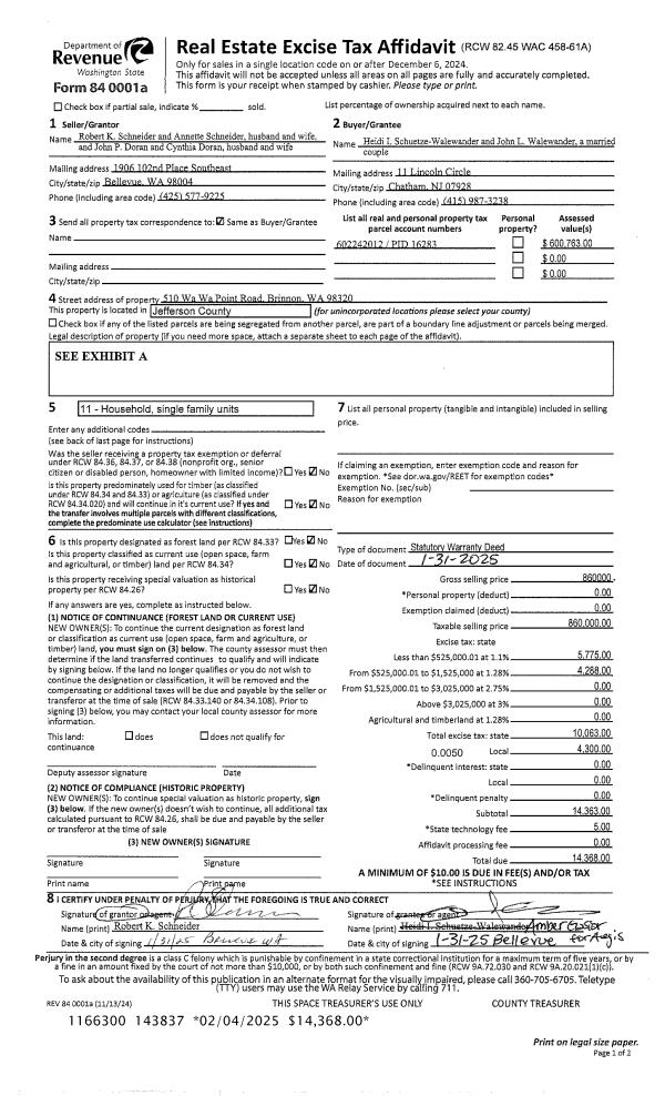 | 1 | 01/31/2025 | SWD | Statutory Warranty Deed | ROBERT K SCHNEIDER | HEIDI I SCHUETZE-WALEWANDER & | | | $860,000.00 | 143837 | |