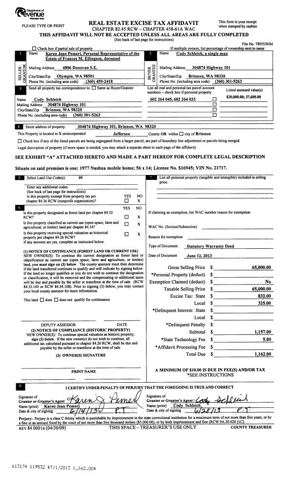| 1 | 06/12/2013 | SWD | Statutory Warranty Deed | | CODY SCHLEICH | | | $65,000.00 | 119532 | |