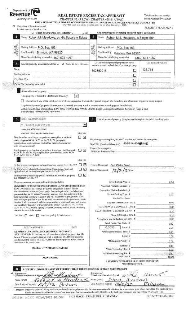 | 1 | 12/02/2022 | QCD | Quit Claim Deed | ROBERT MEADOWS | ROBERT M J MEADOWS | | | | 140230 | |