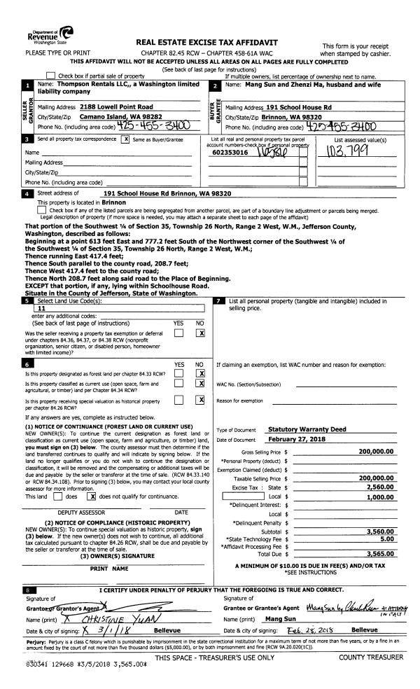 | 3 | 02/27/2018 | SWD | Statutory Warranty Deed | THOMPSON RENTALS LLC | MANG SUN & ZHENZI MA | | | $200,000.00 | 129668 | |