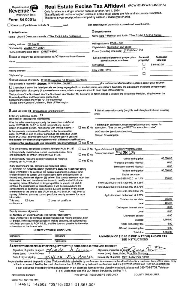 | 2 | 05/02/2024 | SWD | Statutory Warranty Deed | STEVE & LINDA OWEN 2/5 | HARRISON LIVING TRUST | | | $85,000.00 | 142602 | |