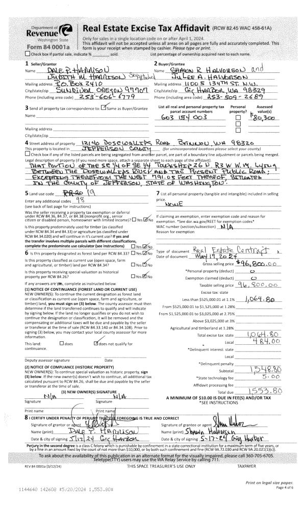 | 1 | 05/17/2024 | REC | Real Estate Contract | HARRISON LIVING TRUST | SHAWN R HALVORSON | | | $96,800.00 | 142608 | |