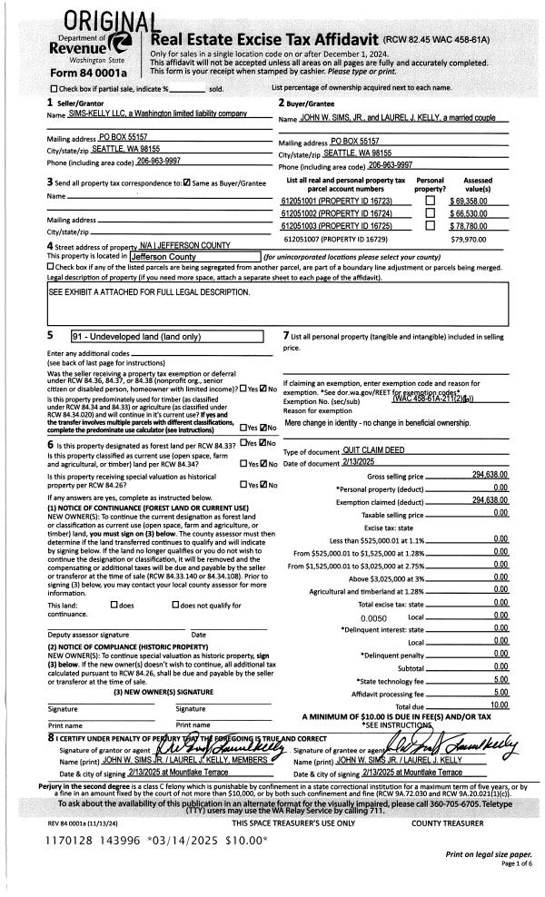 | 2 | 02/13/2025 | QCD | Quit Claim Deed | SIMS-KELLY LIMITED LIABILITY COMPANY | JOHN W SIMS & | | | | 143996 | |