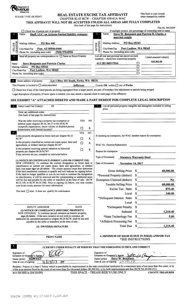 | 1 | 11/14/2017 | SWD | Statutory Warranty Deed | SHEFF LLC | STEVE W BENJAMIN | | | $68,000.00 | 129052 | |