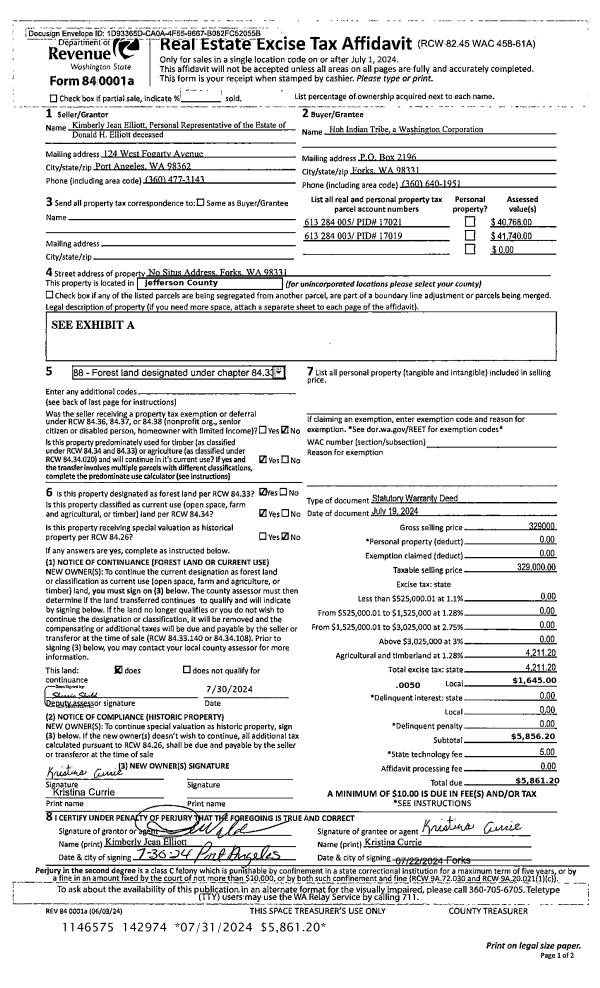 | 1 | 07/19/2024 | SWD | Statutory Warranty Deed | DONALD H ELLIOTT | HOH INDIAN TRIBE | | | $329,000.00 | 142974 | |