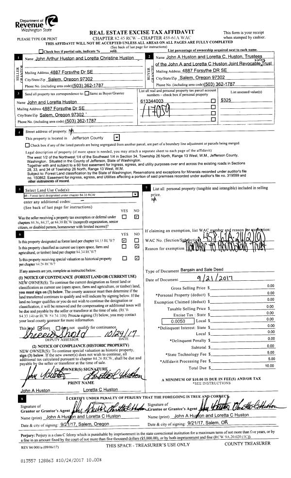 | 1 | 09/21/2017 | BSD | Bargain and Sale Deed | JOHN A HUSTON | JOHN A & LORETTA C HUSTON JOINT REV TRUST | | | | 128863 | |