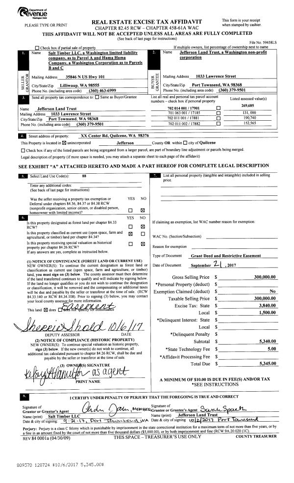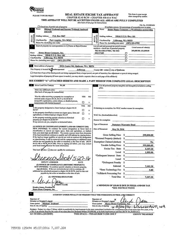 | 2 | 05/24/2016 | SWD | Statutory Warranty Deed | MICHAEL TRABAND | HAMA HAMA COMPANY | | | $399,000.00 | 125494 | |