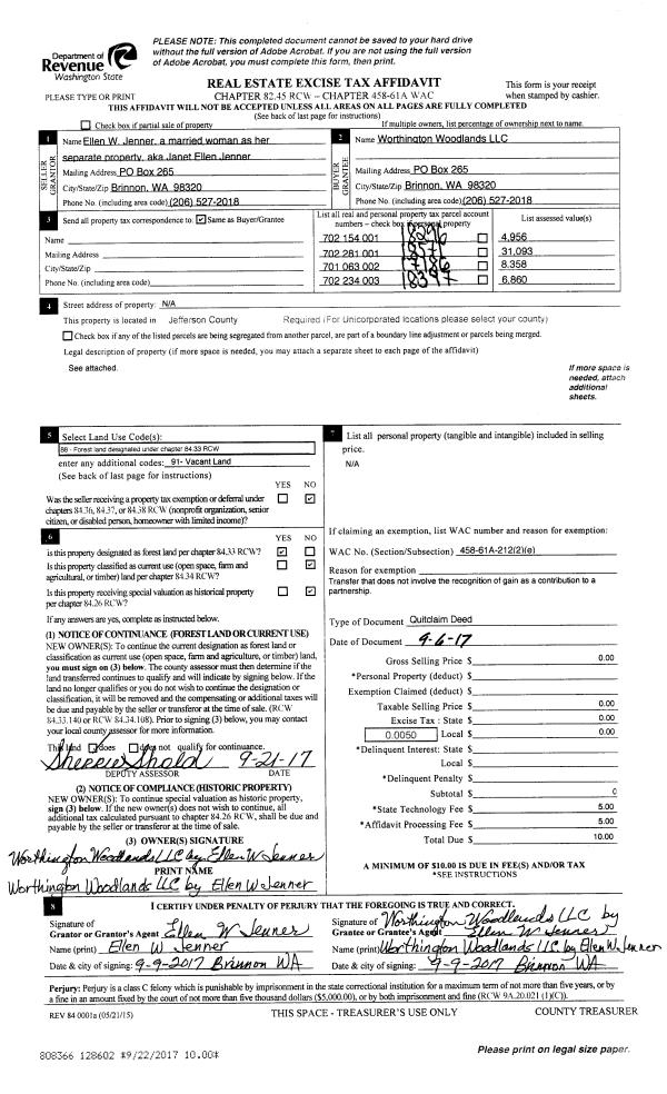 | 1 | 09/06/2017 | QCD | Quit Claim Deed | ELLEN W JENNER | WORTHINGTON WOODLANDS LLC | | | | 128602 | |