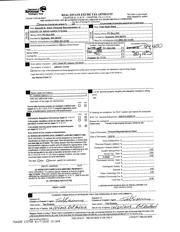 | 1 | 12/03/2019 | PRD | Personal Representatives Deed | ARVID H QUAM | TYLER N WARD | | | | 133785 | |