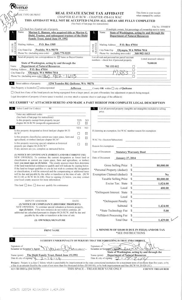 | 1 | 01/27/2014 | SWD | Statutory Warranty Deed | MARION G HANSEN TRUSTEE | STATE OF WASHINGTON-DNR | | | $80,000.00 | 120724 | |