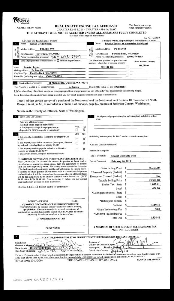 | 1 | 02/10/2015 | SPWD | Special Warranty Deed | KITSAP CREDIT UNION | BROOKE TAYLOR | | | $85,360.00 | 122696 | |