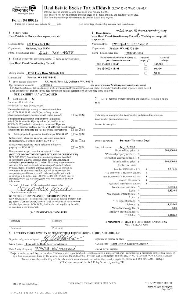 | 1 | 08/28/2023 | SWD | Statutory Warranty Deed | PATRICIA A BECK | HOOD CANAL SALMON ENHANCEMENT GROUP | | | | 141488 | |