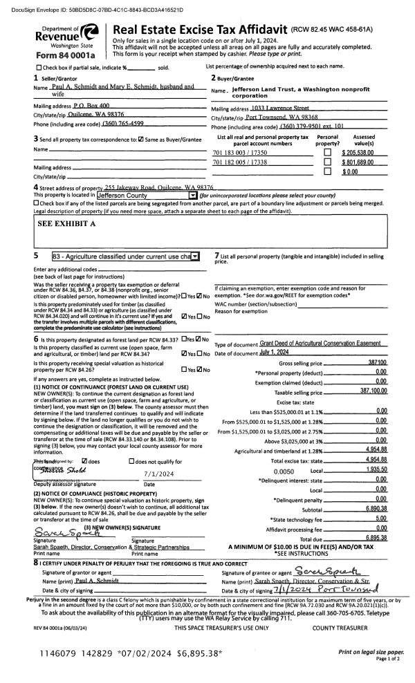 | 2 | 07/01/2024 | CONS EASE | CONSERVATION EASEMENT | PAUL A SCHMIDT | JEFFERSON LAND TRUST | | | $387,100.00 | 142829 | |