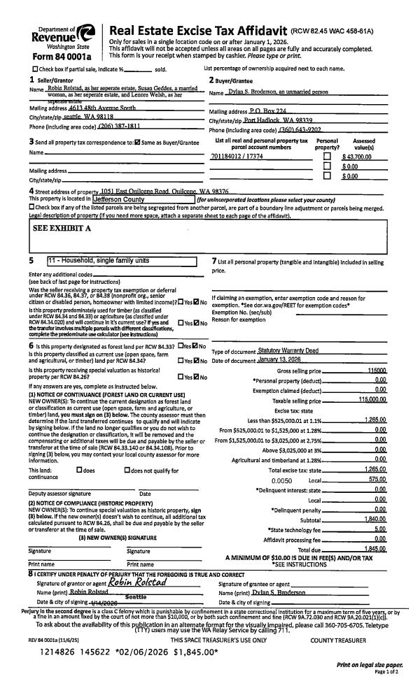 | 1 | 01/13/2026 | SWD | Statutory Warranty Deed | ROBIN ROLSTAD | DYLAN S BRODERSON | | | $115,000.00 | 145622 | |