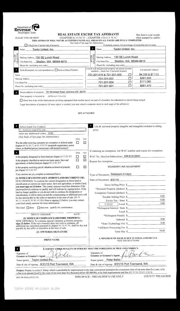 | 1 | 09/17/2015 | SWD | Statutory Warranty Deed | TAYLOR UNITED INC | STATE OF WASHINGTON-DNR | | | $440,000.00 | 123959 | |