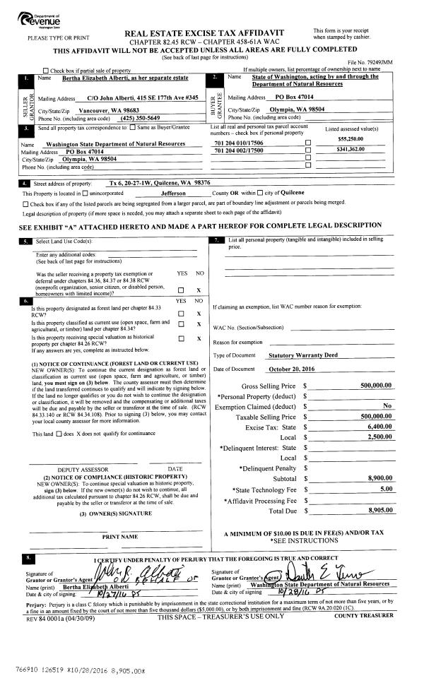 | 1 | 10/20/2016 | SWD | Statutory Warranty Deed | BERTHA E ALBERTI | STATE OF WASHINGTON-DNR | | | | 126519 | |