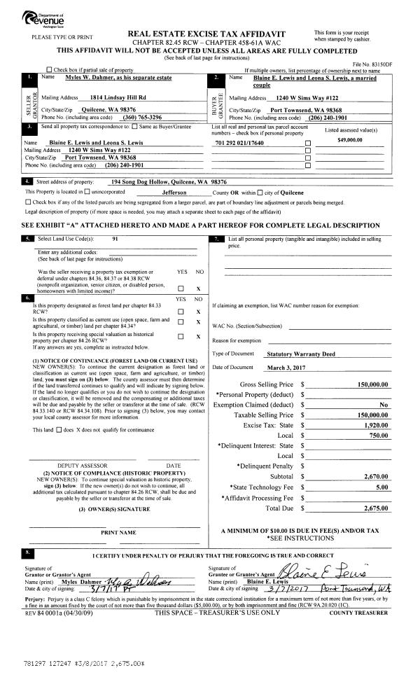 | 1 | 03/03/2017 | SWD | Statutory Warranty Deed | MYLES W DAHMER | BLAINE E & LEONA S LEWIS | | | $150,000.00 | 127247 | |