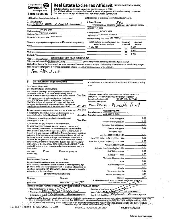 | 1 | 01/13/2026 | WD | Warranty Deed | TERRI L HARDAN | HARDAN LIVING TRUST | | | | 145555 | |