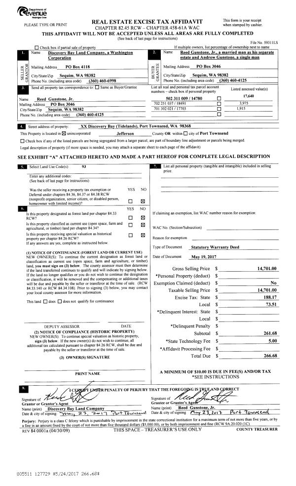 | 2 | 05/19/2017 | SWD | Statutory Warranty Deed | DISCOVERY BAY LAND CO | REED JR & ANDREW GUNSTONE | | | $14,701.00 | 127729 | |