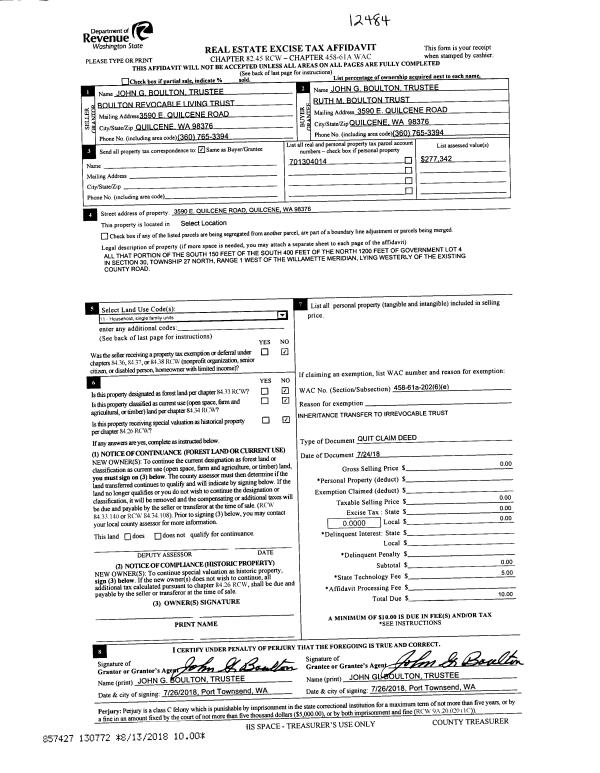 | 2 | 07/24/2018 | QCD | Quit Claim Deed | BOULTON REVOCABLE LIVING TRUST | RUTH M BOULTON TRUST | | | | 130772 | |