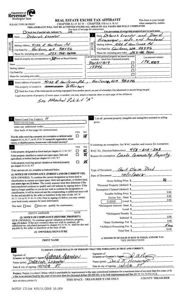 | 1 | 10/11/2018 | QCD | Quit Claim Deed | DEBORAH J LEANDER | DEBORAH LEANDER & DAVID NICEWONGER | | | | 131166 | |