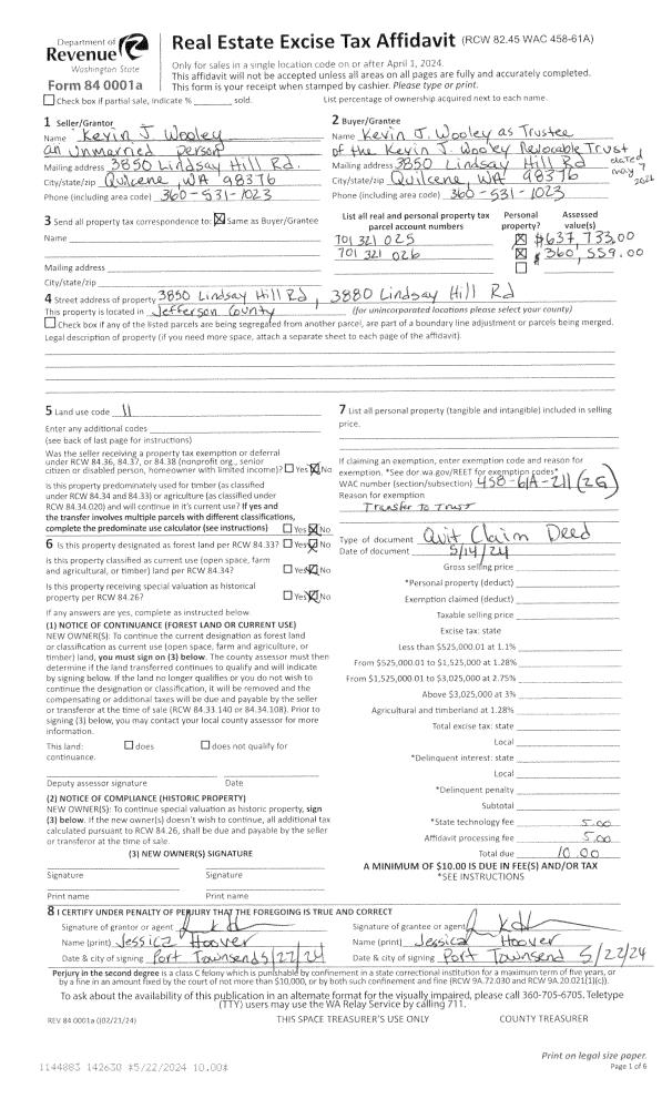 | 1 | 05/14/2024 | QCD | Quit Claim Deed | KEVIN J WOOLEY | KEVIN J WOOLEY REVOCABLE TRUST | | | | 142630 | |