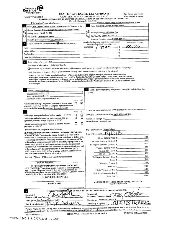 | 2 | 12/22/2015 | TRED | Trustee Deed | LYDIA B GOLSTON TRUSTEE | JOAN C GOLSTON | | | | 126511 | |