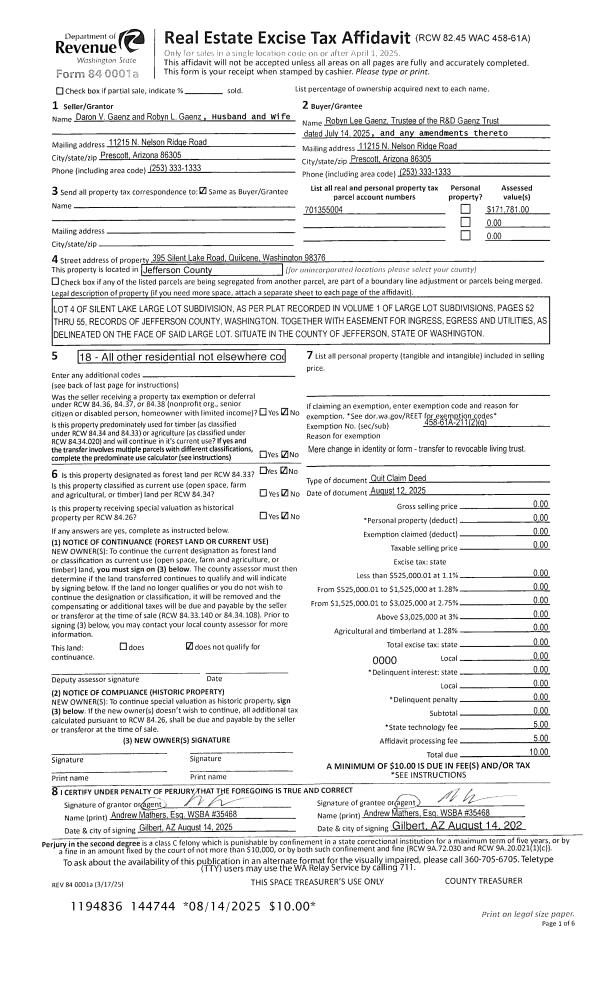 | 1 | 08/12/2025 | QCD | Quit Claim Deed | DARON V & ROBYN L GAENZ | R & D GAENZ TRUST | | | | 144744 | |